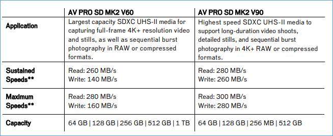Le nuove schede AV PRO SD MK2 di maggiore capacità hanno una velocità minima, ma sono dotate della tecnologia Stable Stream per ottimizzare le prestazioni di registrazione per l’intera capacità della scheda (e per tutta la durata della sessione di registrazione) con velocità di scrittura sostenute minime rispettivamente di 140 MB/s (V60) e 260 MB/s (V90).