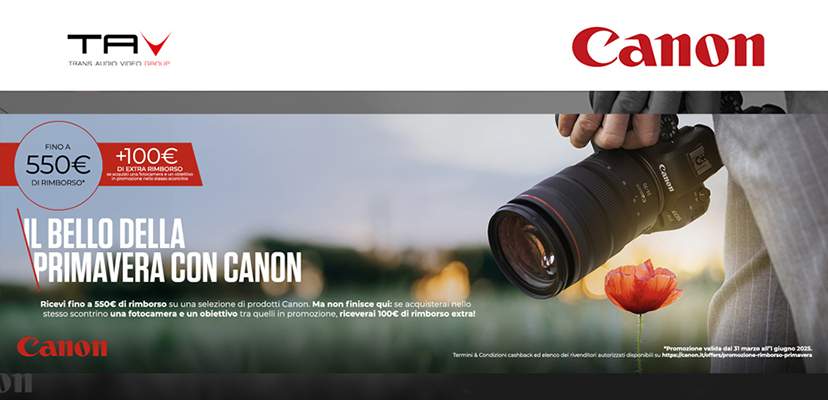 Dal 31 marzo al 1° giugno 2025, solo presso i rivenditori autorizzati gli utenti finali potranno acquistare uno o più prodotti in promozione ricevendo fino a 550€ di rimborso su una selezione di prodotti Canon.