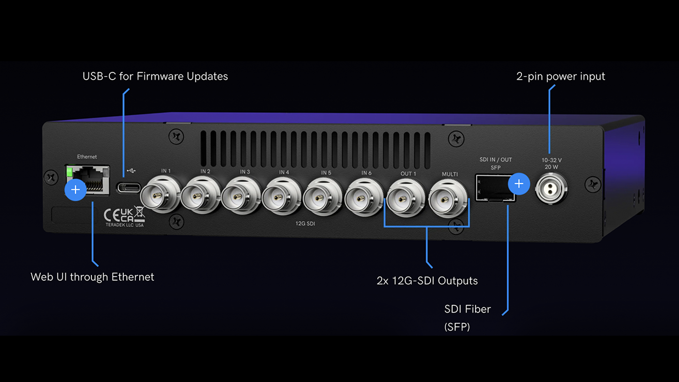 - Intelligenza integrata: emette un singolo feed 12G-SDI pulito per garantire l’integrità del segnale anche per i clienti più esigenti.