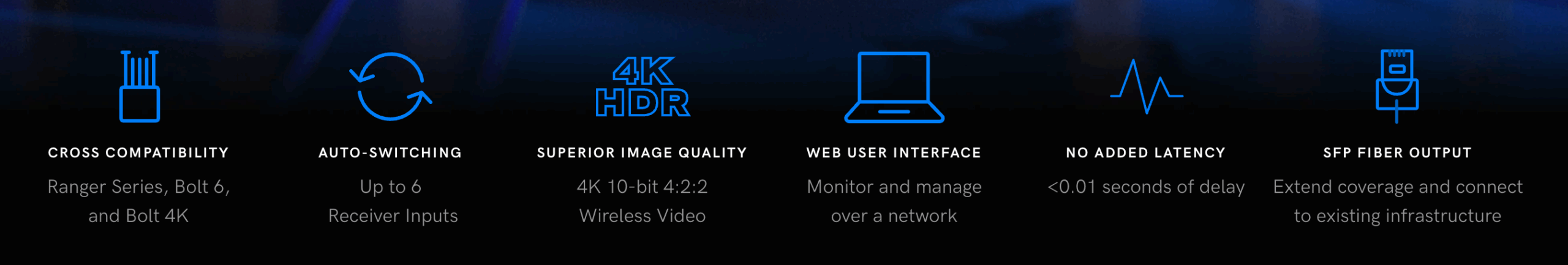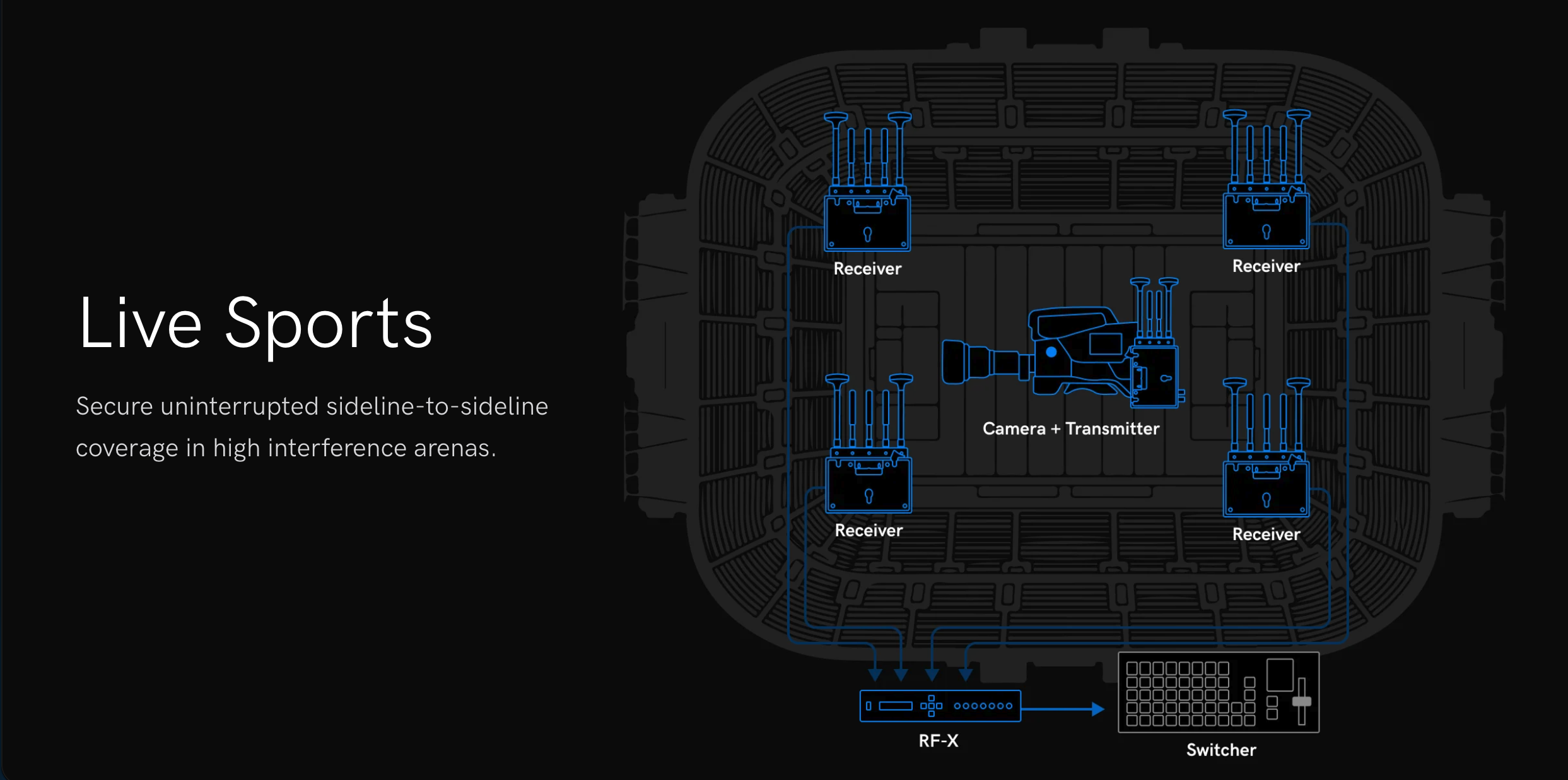 - Fail-over senza interruzioni: rileva e seleziona automaticamente il segnale video migliore da un massimo di quattro ricevitori Ranger o Bolt.