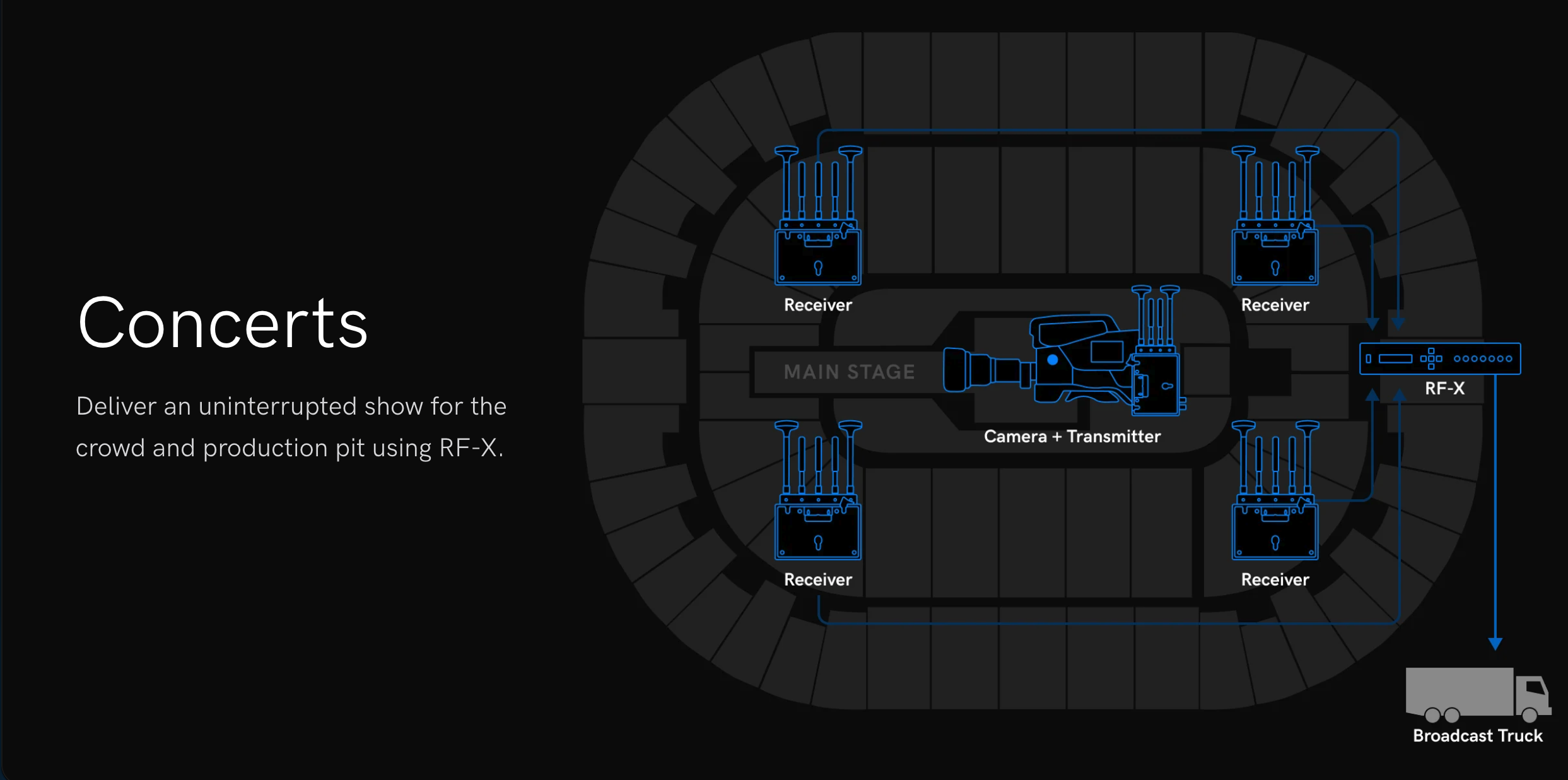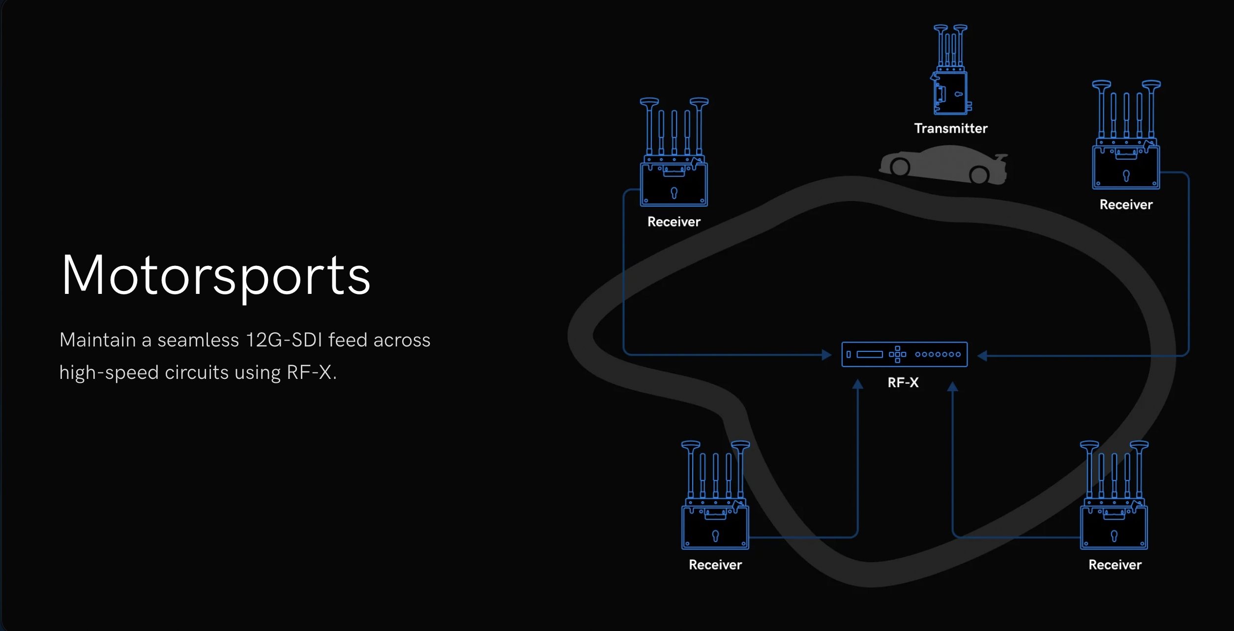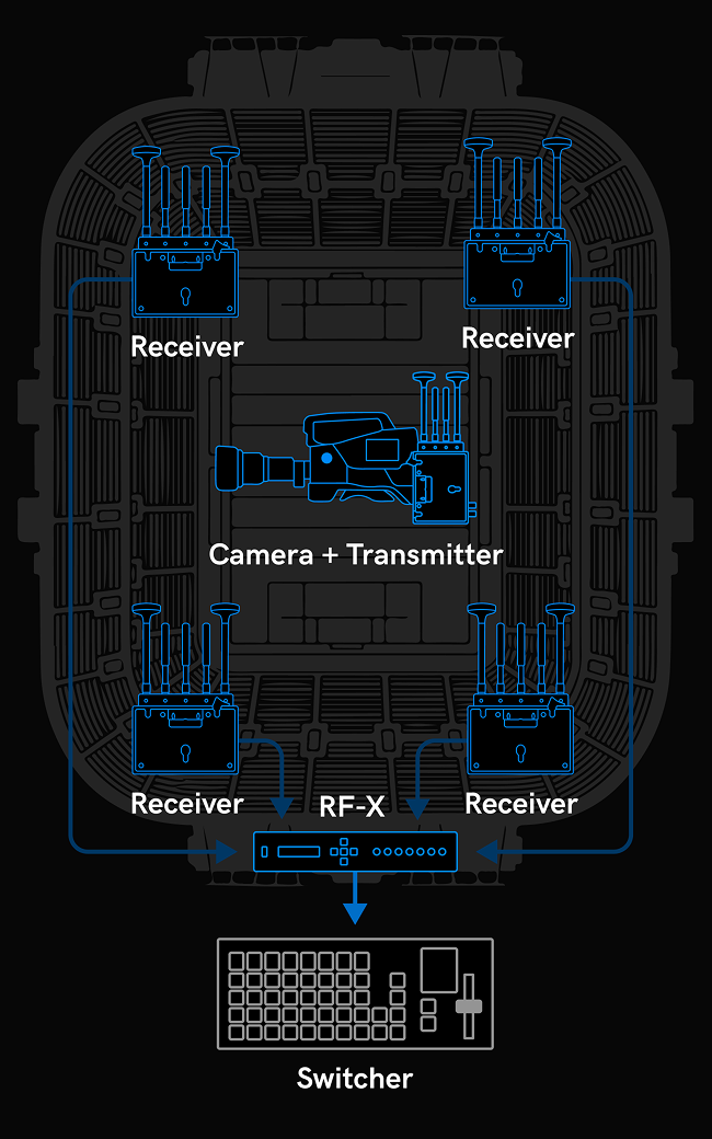RF-X monitora la qualità del segnale in tempo reale e passa automaticamente al ricevitore più potente al variare delle condizioni RF. Fornisce un’uscita HDR 12G-SDI pulita e ininterrotta, eliminando la commutazione manuale e riducendo il carico di lavoro dell’operatore nelle produzioni più impegnative.
