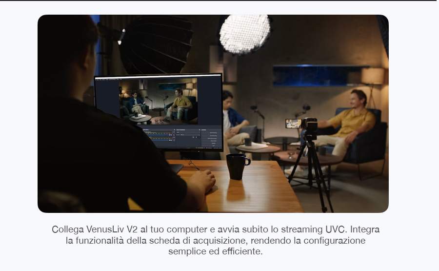 Collega VenusLiv V2 al tuo computer e avvia subito lo streaming UVC. Integra la funzionalità della scheda di acquisizione, rendendo la configurazione semplice ed efficiente.